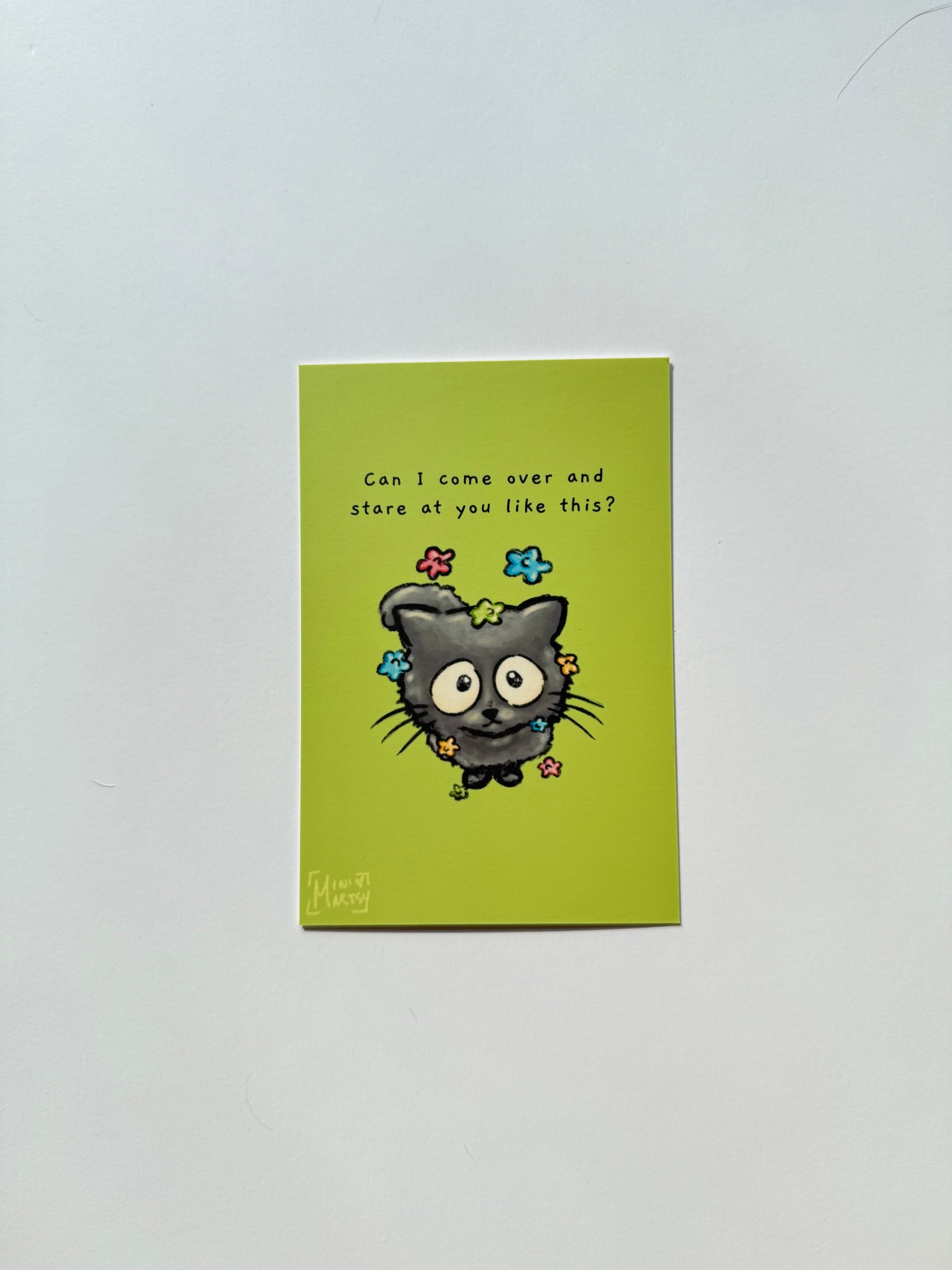 Cute cat staring artwork printed on 16pt photo paper. Small print, great for hanging on fridges, photo displays, or as framed art! Inspired by soot sprites!