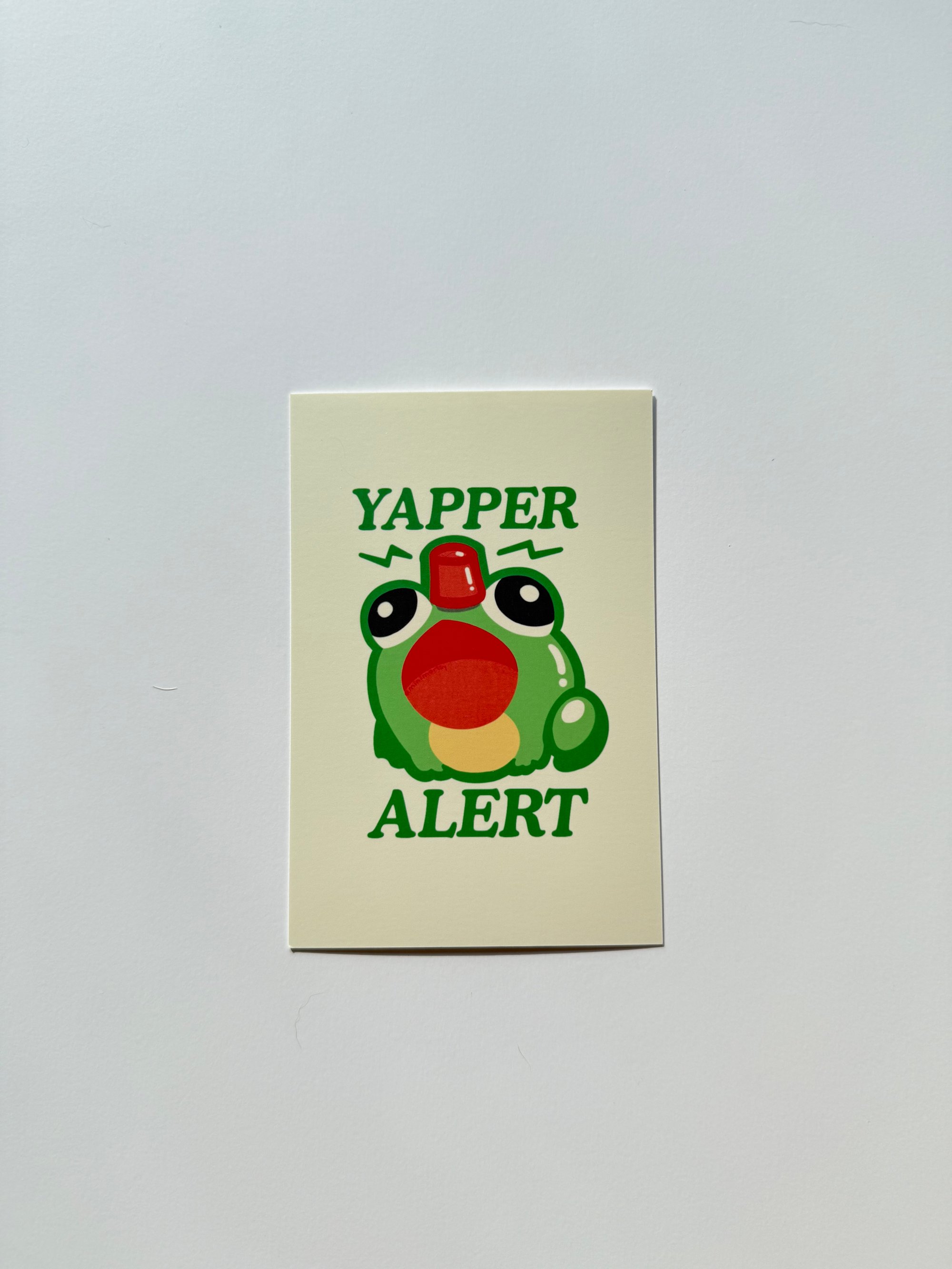 Yapper Alert Frog artwork printed on 16pt photo paper. Small print, great for hanging on fridges, photo displays, or as framed art!